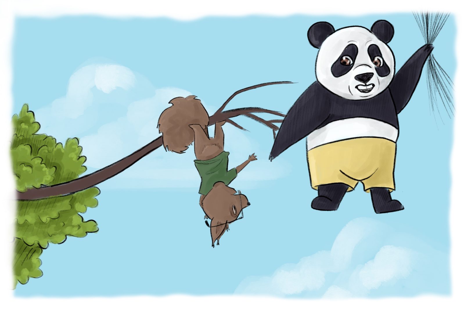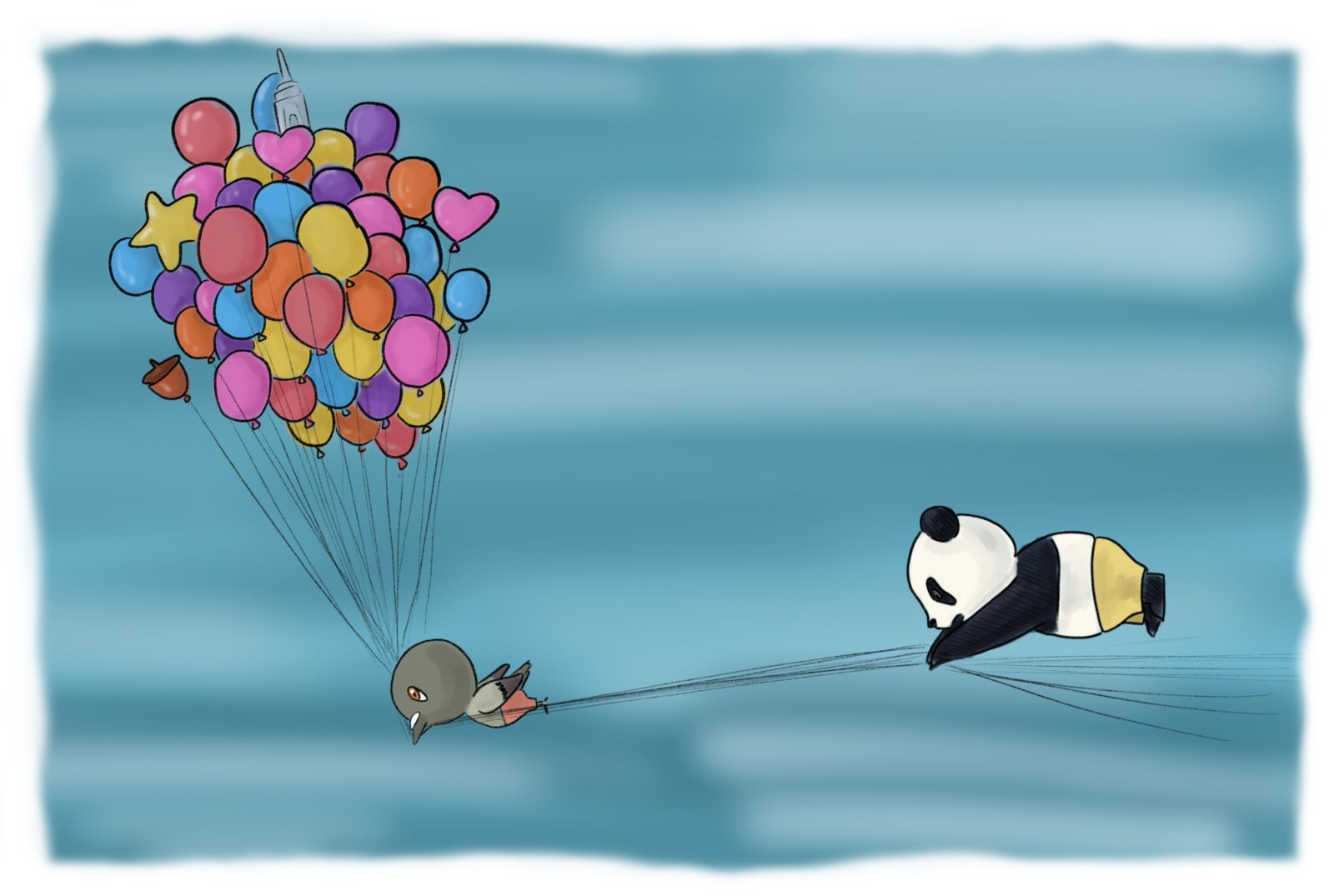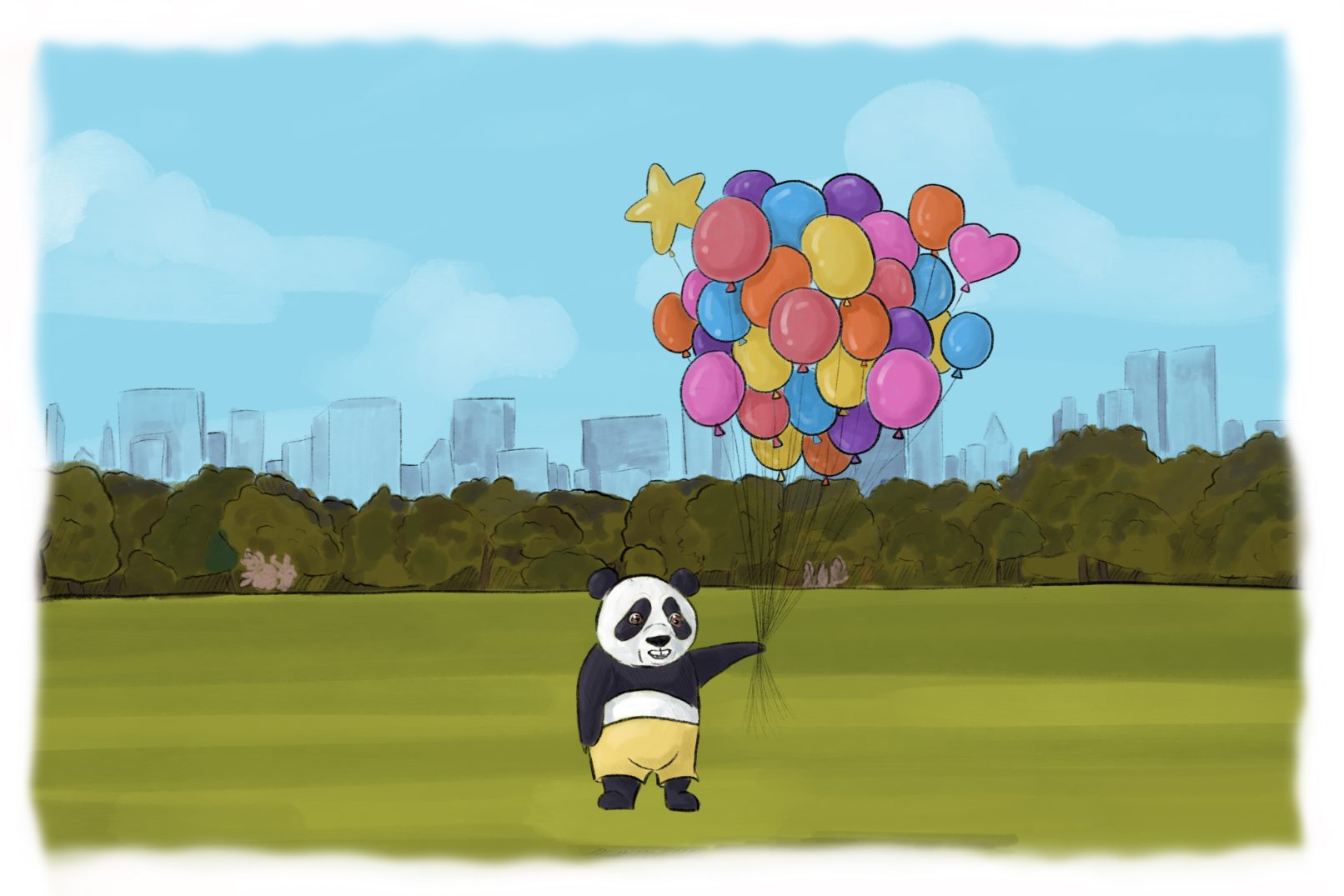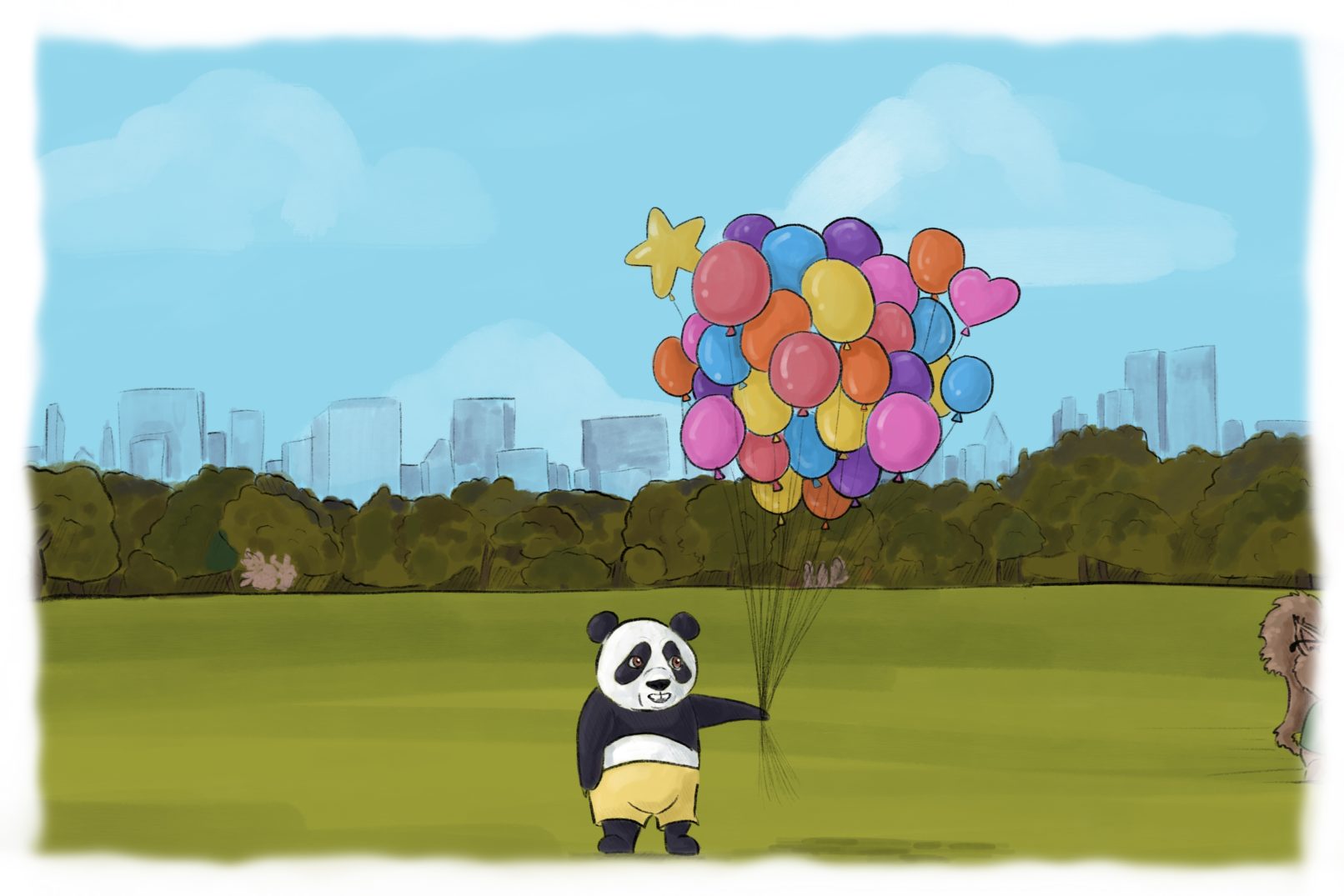 Panda: “I can’t reach! I have to let go of the balloons or else I’ll float away!”