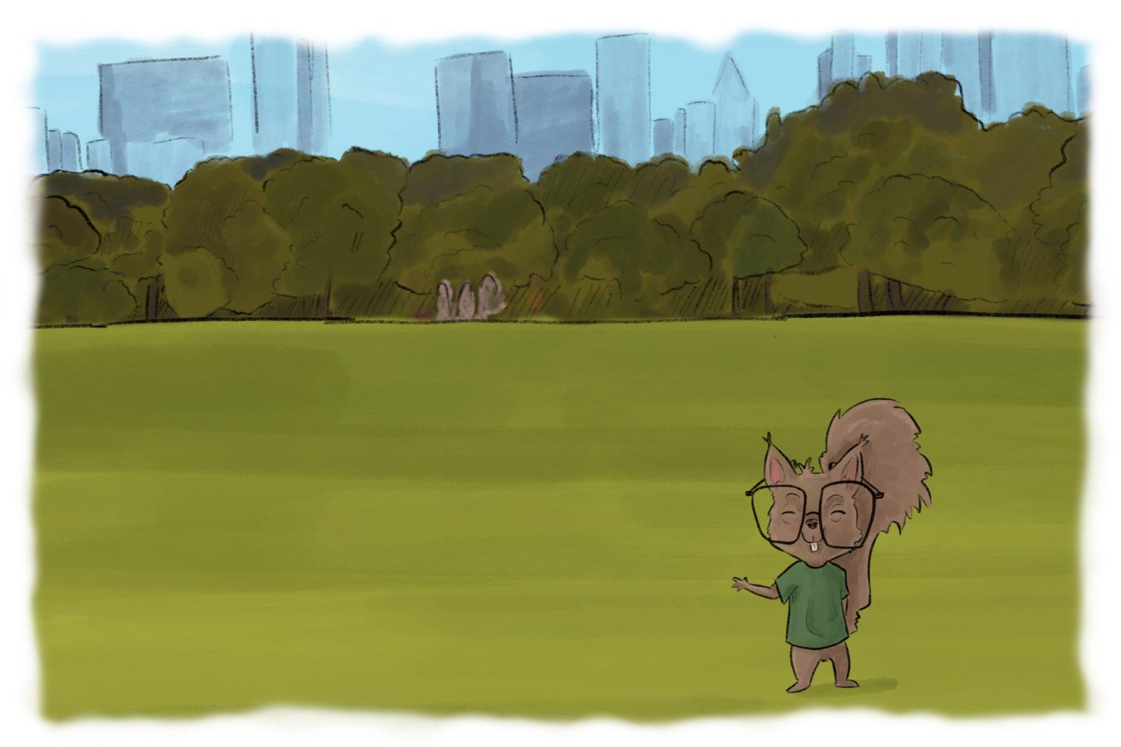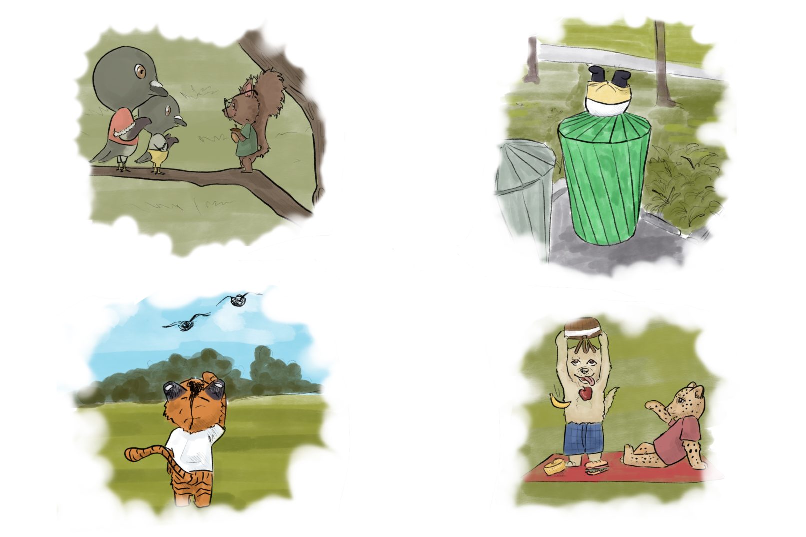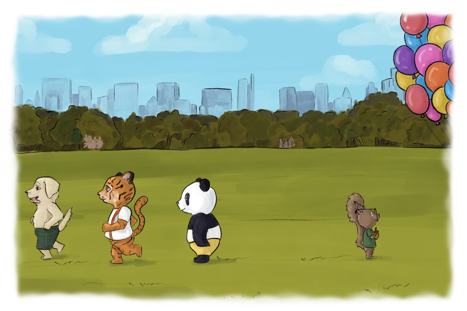 It was a sunny afternoon in the Springtime. Baby Panda, Tiger, Dog and Squirrel were walking in Central Park near the Great Lawn, looking for Pigeon so they could all have a picnic together and play frisbee. They had planned to meet at 2 o’clock.