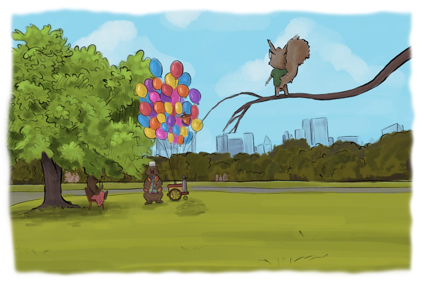 “Balloons!” Squirrel suddenly shouted from the tree. “Look how many different kinds they have! Purple, red, blue, green, yellow, orange, pink!”